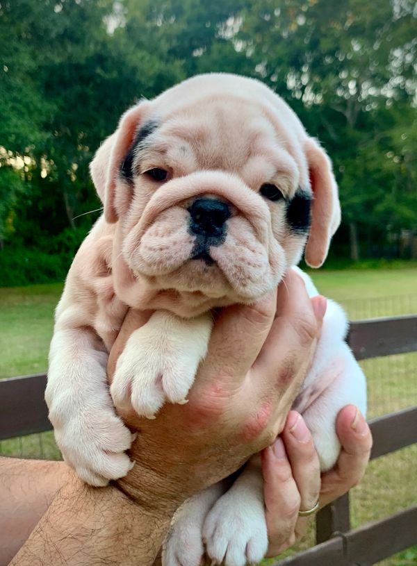 If this isn’t the cutest bulldog puppy on the gulf coast, I don’t know what is?! This little guy is 10 pounds of fun! He’s got lots of puppy breath kisses for ya and he loves to be held and to play! He’s very fast and playful, will run circles around you all over the house. This guy has exceptional good looks, but also has a healthy bloodline and excellent demeanor. On moms side we have champion pedigreed dogs, and on dads side we have exotic colors. When we put them together we get the perfect litter! All of our pups confirm to the akc breed standard for English bulldogs.